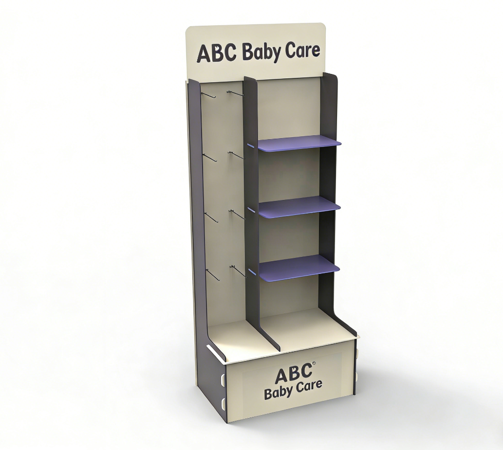 Identity: Retail/warehouse display stands, floor-standing wooden racks.