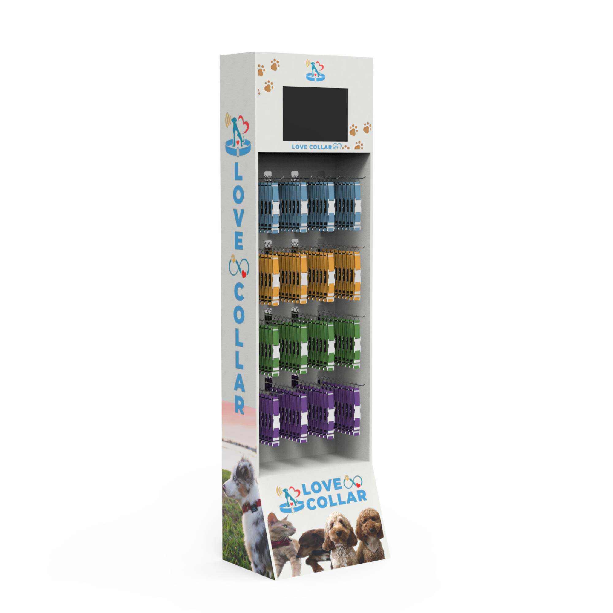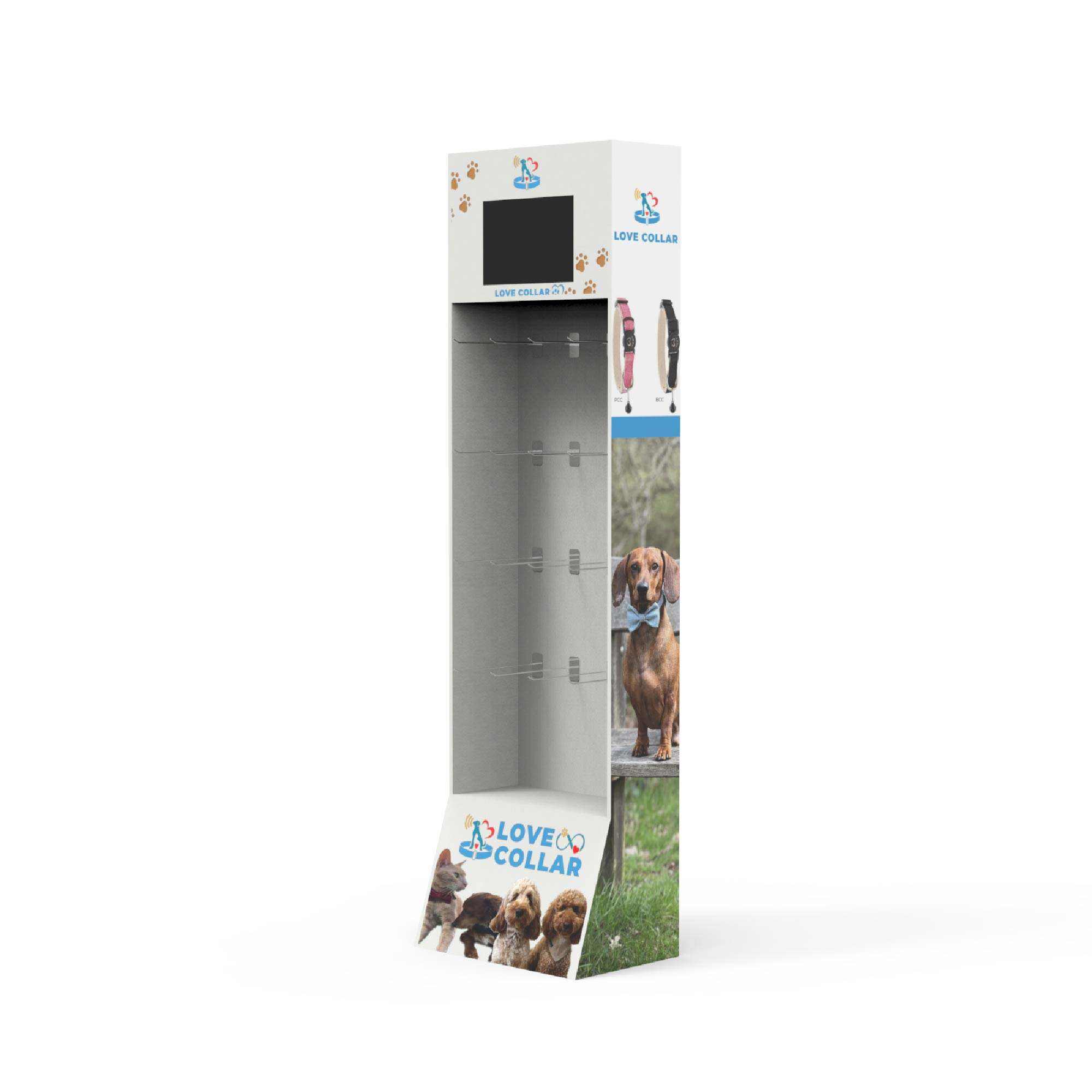 Espositore moderno da terra per alimenti per animali domestici, scaffali resistenti in cartone con display LCD, espositore personalizzato per cani e gatti