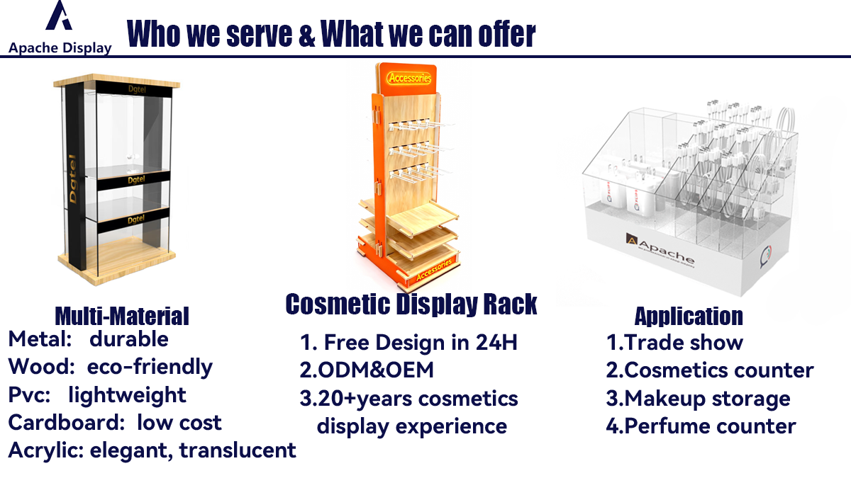 2005年より、アパッチ社は店舗用ディスプレイ什器業界の専門企業として、カスタムディスプレイの設計・製造に特化して参りました。特に、複数素材を組み合わせたディスプレイ分野において高い実績を誇ります。当社の経験豊富なデザイン・エンジニアリングチームは、業界における長年の知見を持ち、最新のソフトウェアを駆使し、実際の生産工程を深く理解しています。当社では、現代的な技術および高精度機器を活用し、切断、レーザー彫刻、穴開け、ダイヤモンド研磨などの工程を実施しています。熟練した生産チームが、プロフェッショナルなOEM/ODMサービスを提供いたします。当社の製品および製造プロセスは、輸出用段ボール箱への梱包前に厳格な品質管理(QC)による検査を受けています。