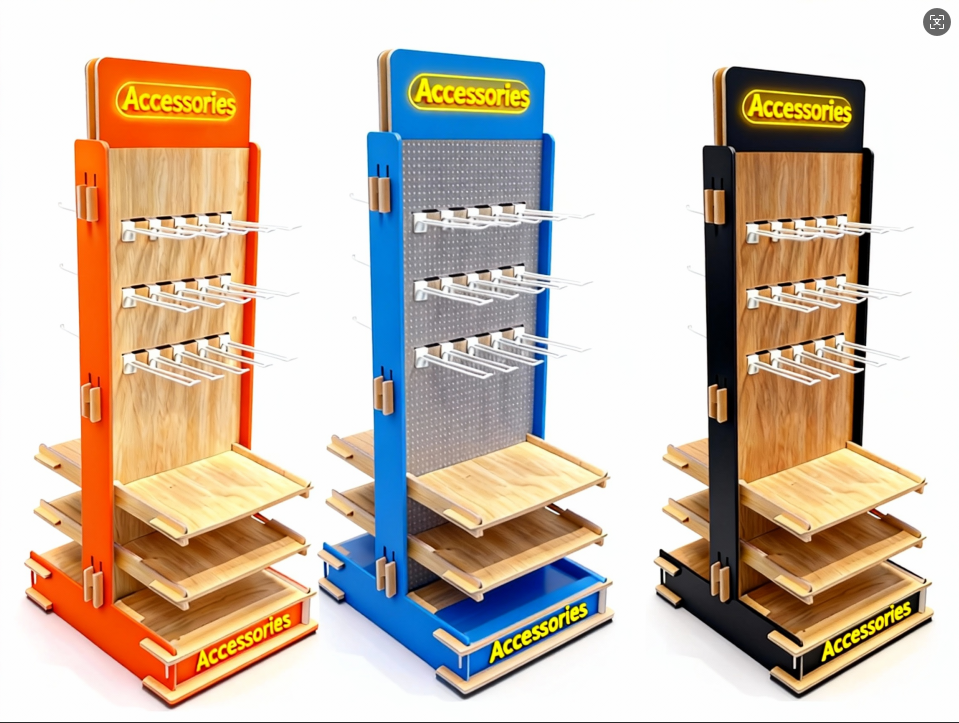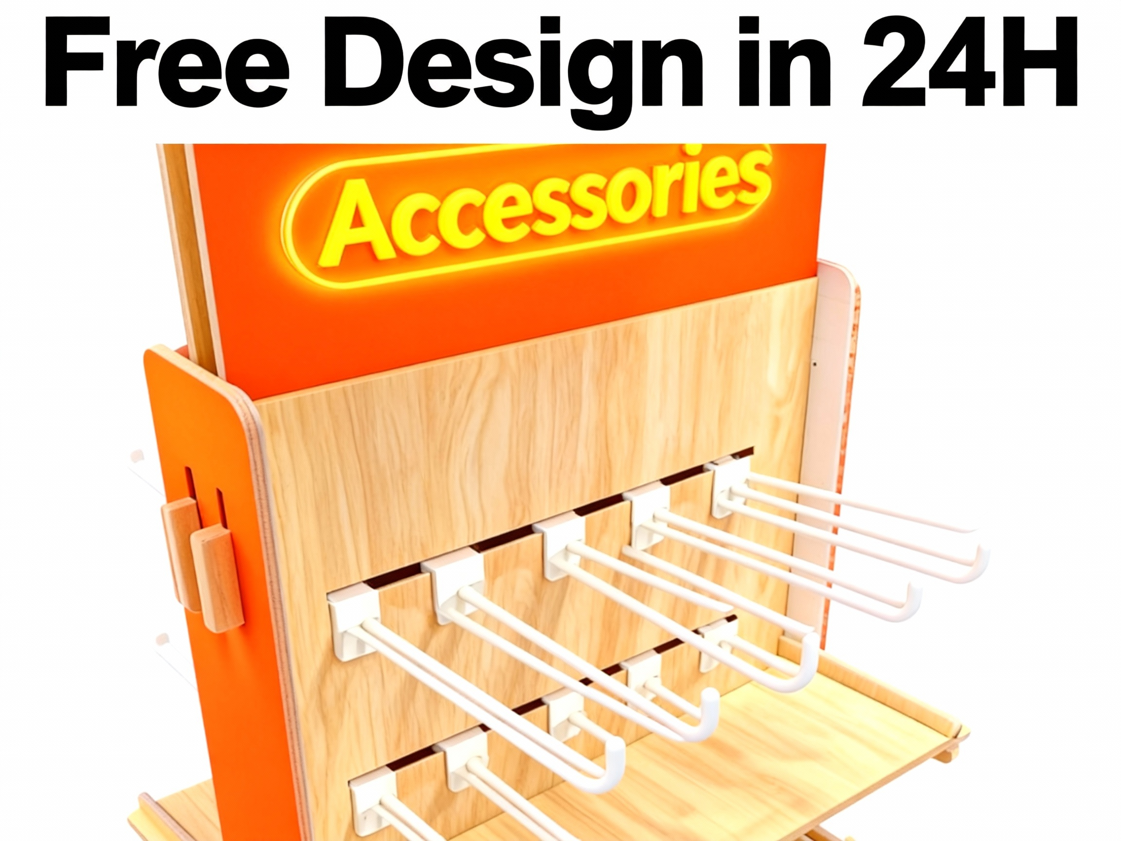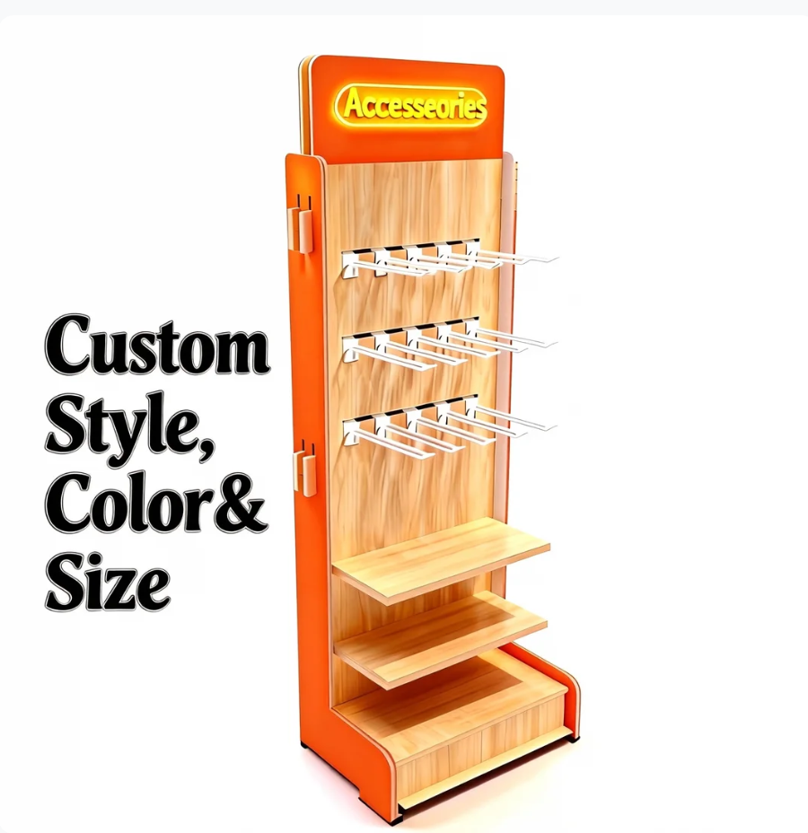 多段式ペグボードフック+木製シェルフ、カスタムカラー・サイズ・ロゴパネル対応、小売店向け上部/下部ブランディングスペース