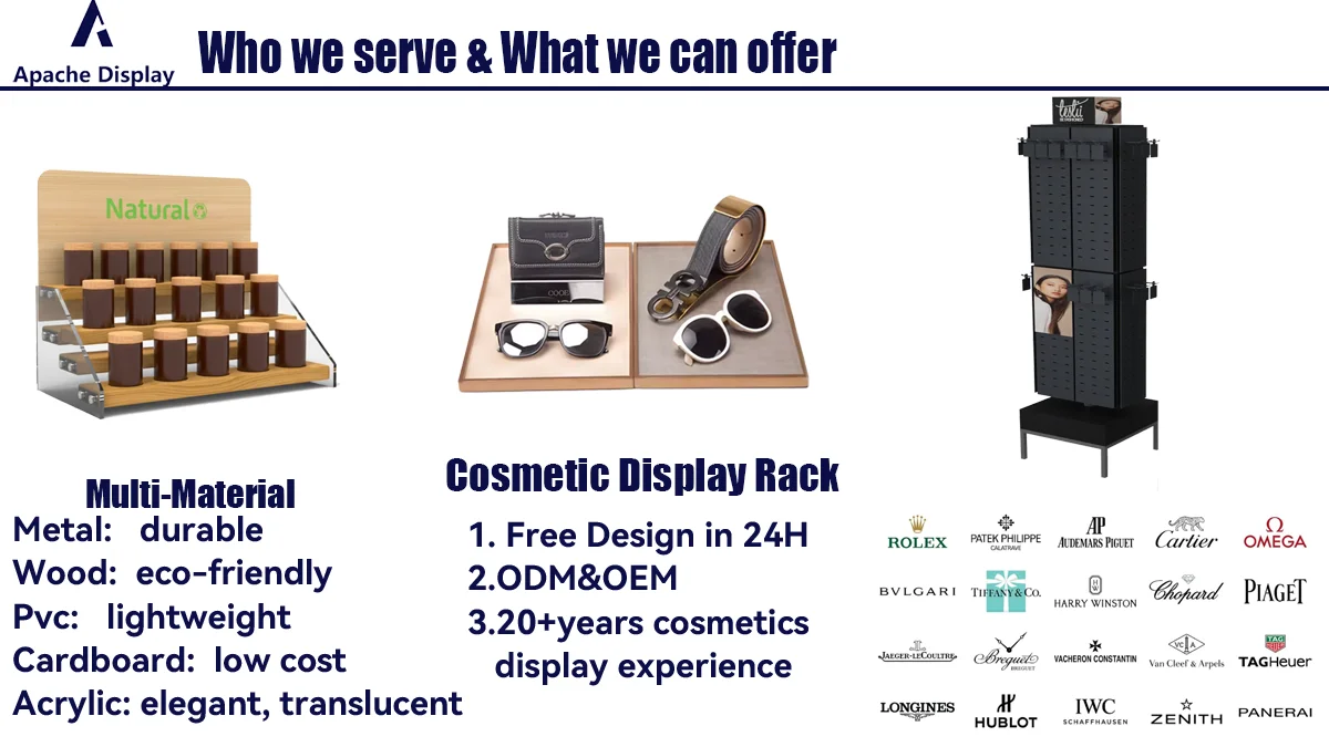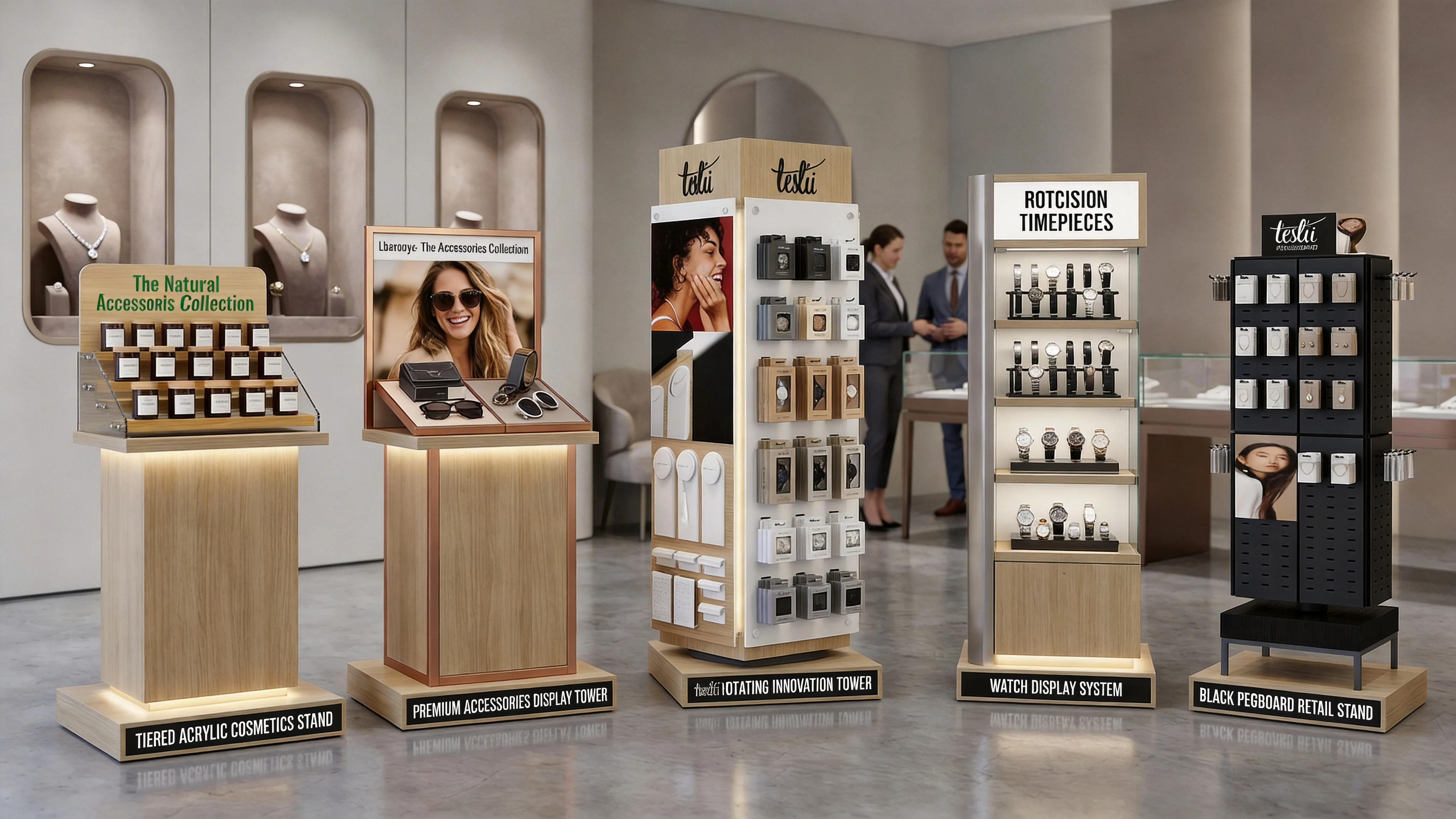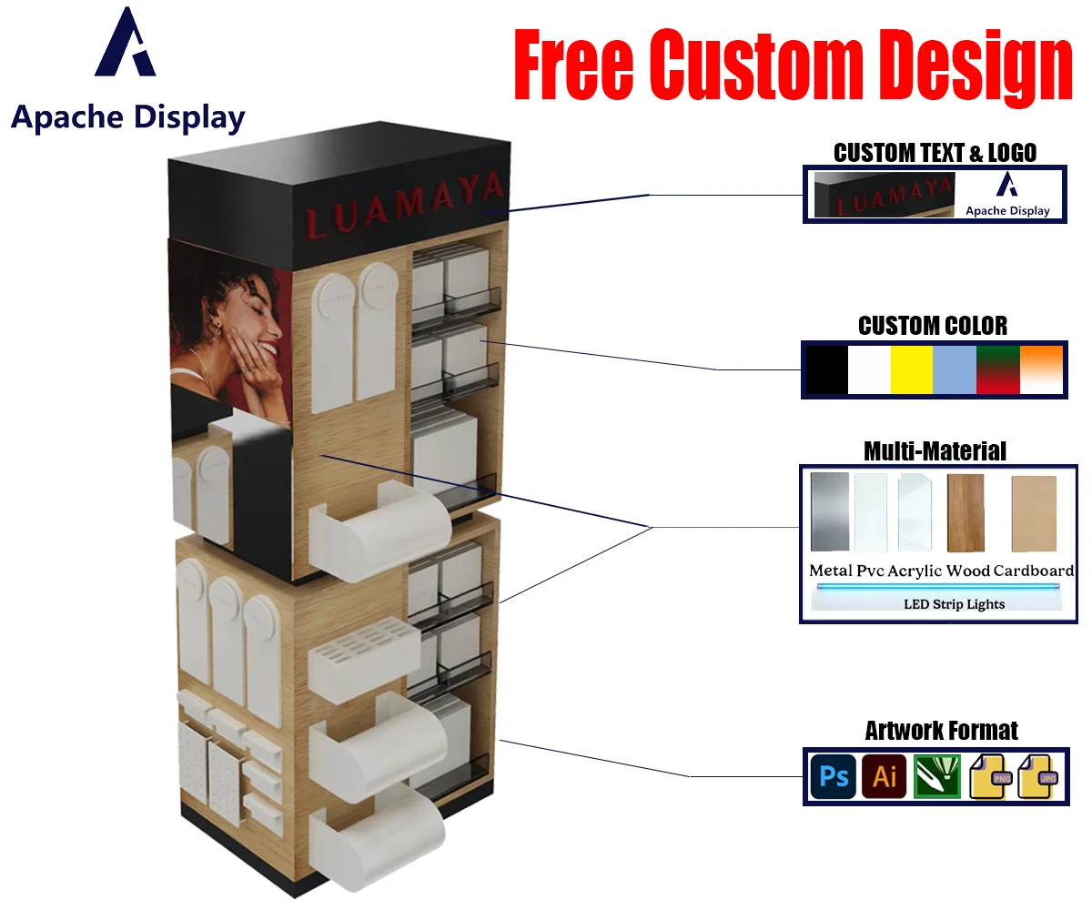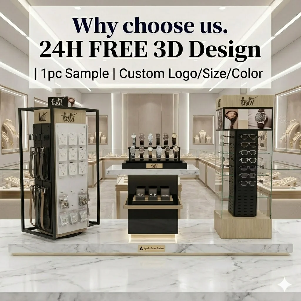 Our custom jewelry and watch display stands are crafted for luxury retail, combining premium materials (wood, metal, acrylic, PVC, cardboard, composite) with tailored design to showcase necklaces, rings, watches, and accessories. Featuring countertop, floor-standing, rotating, and pegboard styles, these fixtures optimize space, highlight product elegance, and align with your brand identity. Ideal for jewelry boutiques, watch stores, department stores, and shopping malls, our displays enhance customer engagement and drive sales through sophisticated, functional merchandising.